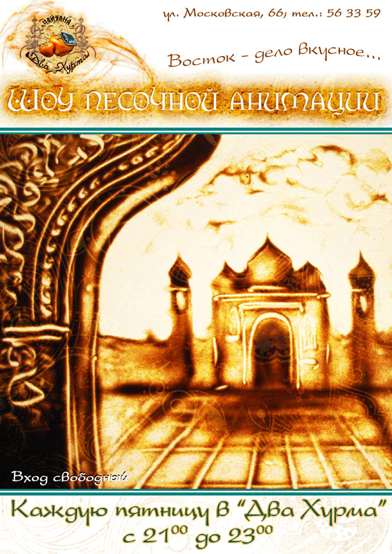 Каждую пятницу чайхана "Два Хурма" приглашает на сказочное "Песочное шоу". Удивительное искусство, создающее необыкновенные картины из песка на Ваших глазах! Начало в 21.00. Вход свободный!
