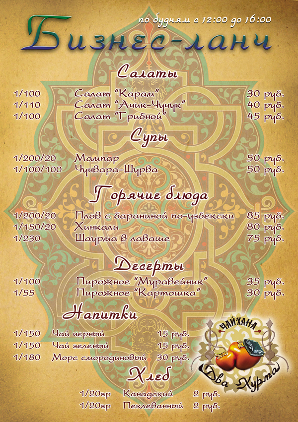 Каждую субботу, чайхана «Два Хурма» приглашает окунуться в чарующую атмосферу востока! Экзотическая кухня, ароматный кофе, кальян, потрясающее исполнение танца живота. Начало в 21.00.