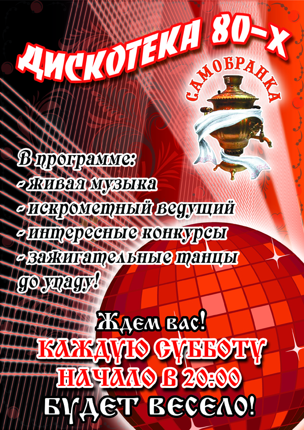 Каждую субботу, трактир «Самобранка» приглашает на «Дискотеку 80-ых». Неподдельную атмосферу того времени возродят старые, но горячо любимые исполнители прошлых лет! Весь вечер с Вами зажигательный ведущий и музыка, объединяющая поколения!