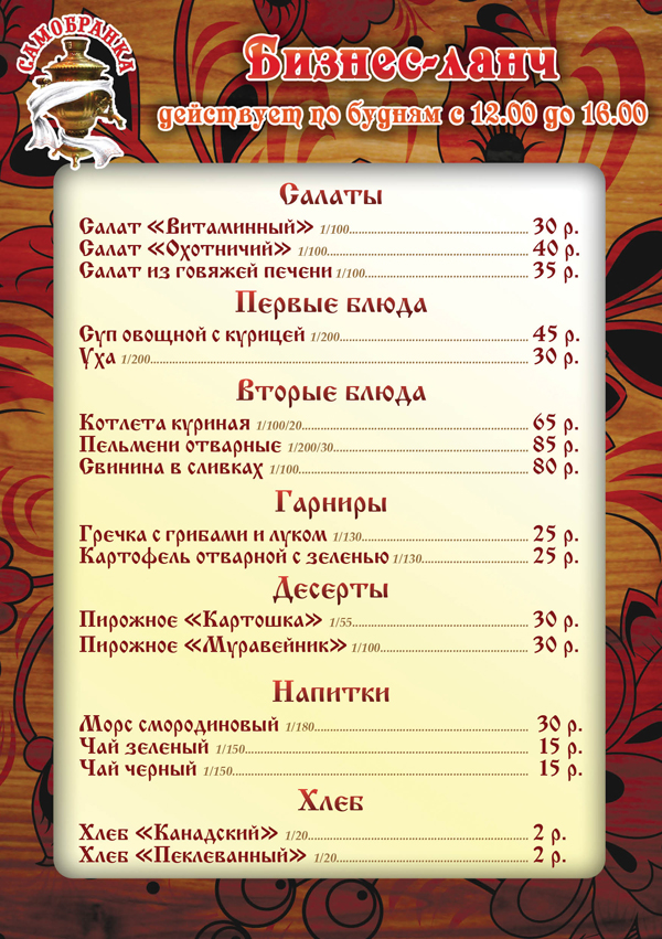 В меню трактира – всегда широкий набор блюд традиционной русской кухни, рассчитанных на различные гастрономические предпочтения.